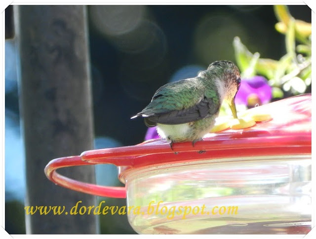Dragutii mei Colibrii... acusi e timpul de plecare.... vreo 4 saptamani??? Acum e mare agitatie, au renuntat sa se mai lupte, si-au impartit gradina si fiecare isi vede de feeder-ul lui. Se mai ciondanesc asa, in joaca si pentru antrenament de viteza. :)